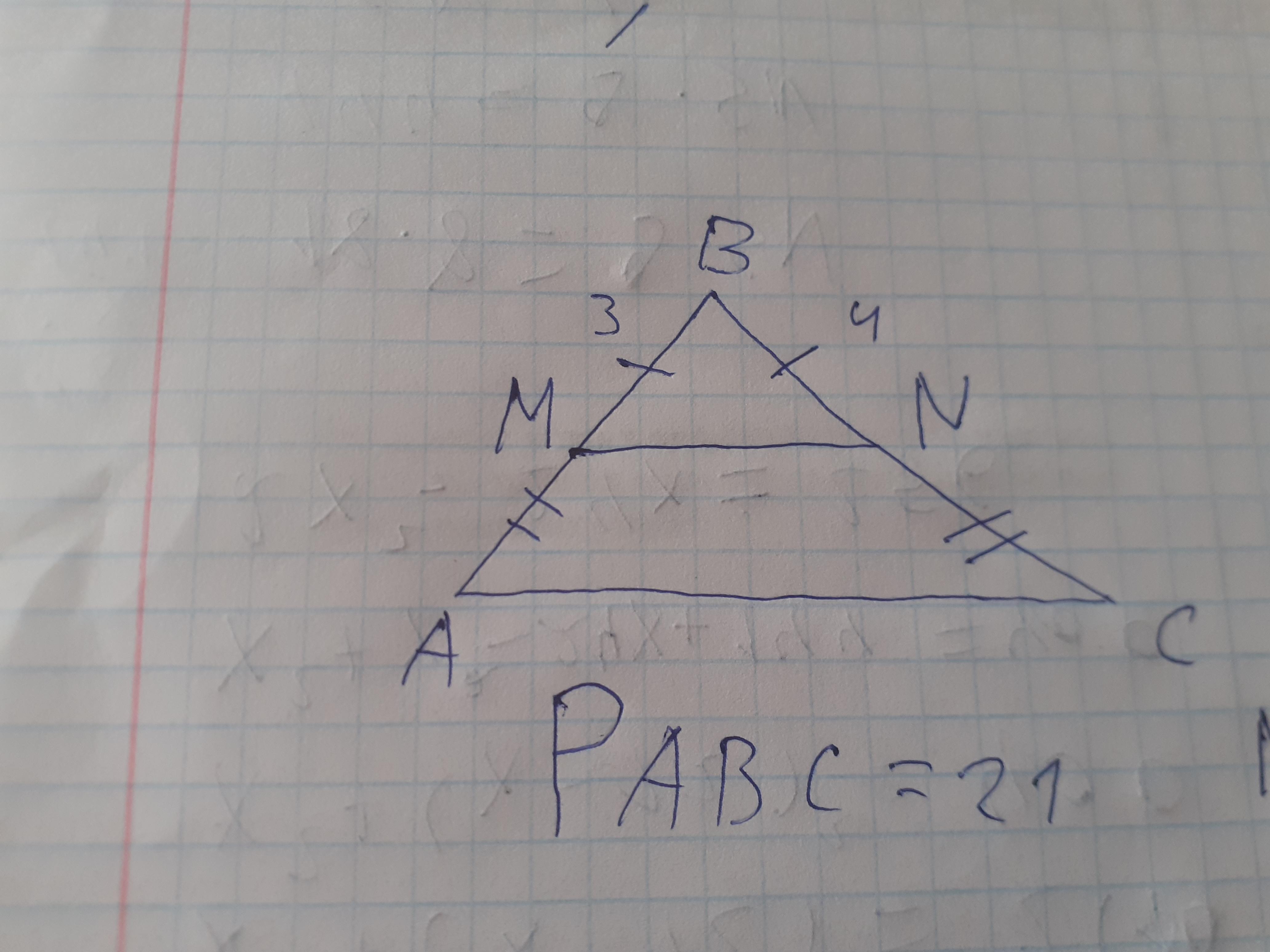 Периметр ABC равен 21 см. Вычислите длину средней линии MN.