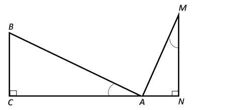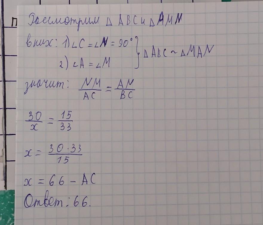 На рисунке изображены два треугольника Δ A B C и Δ M A N , причем угол ∠ B A C = ∠ A M N , ∠ C = ∠ N = 90 0 Найти A C если известно, что A N = 15 , N M = 30 , B C = 33 .