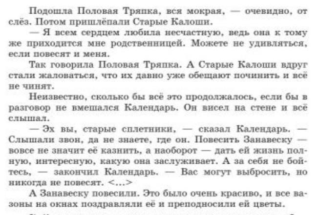 - глаголы речи, описывающие разговор героев сказки: говорила (Половая Тряпка), стали жаловаться (Старые Калоши), вмешался (Календарь), сказал (Календарь), закончил (Календарь).