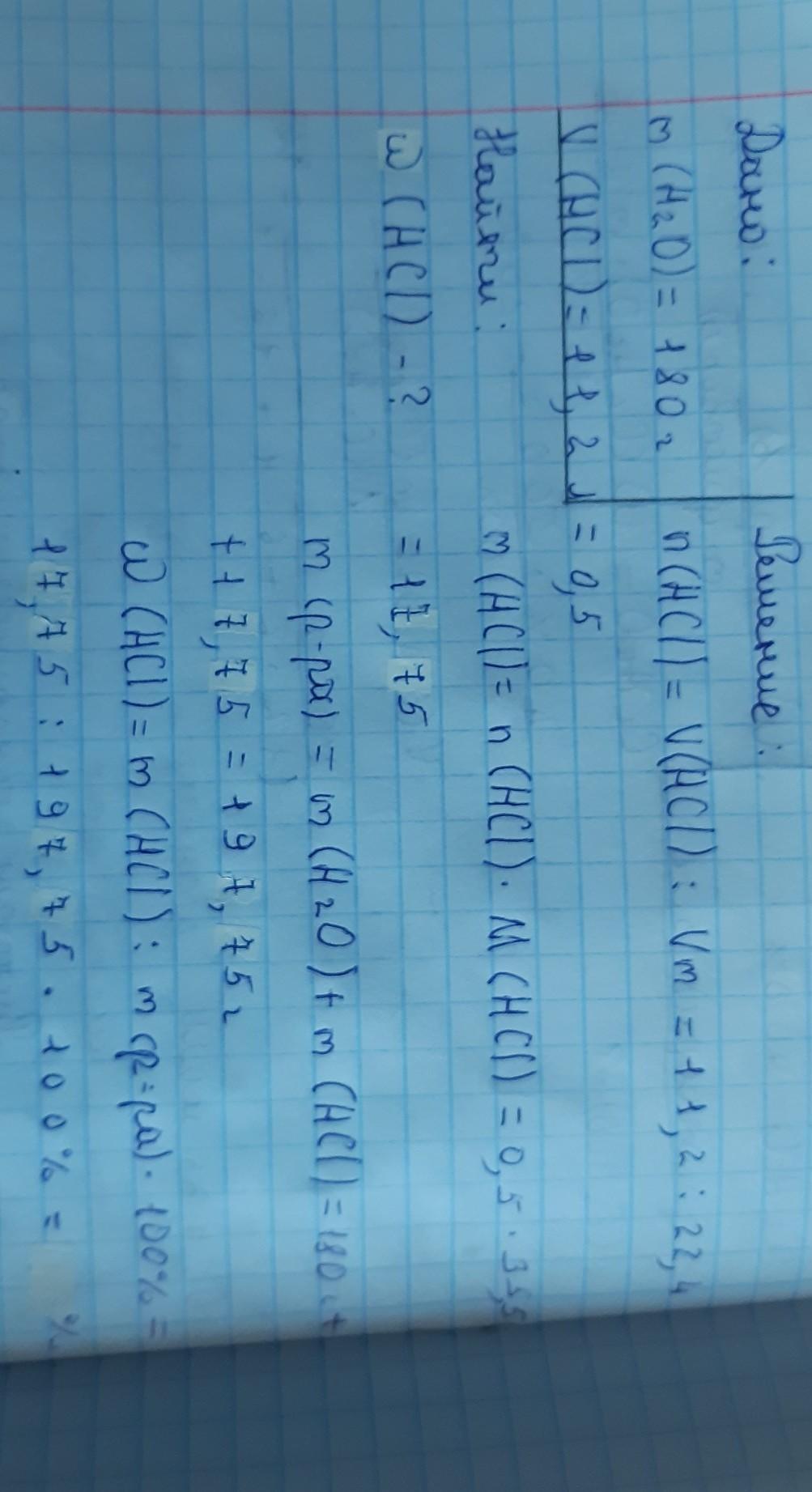 Объяснение:Вычислим количество вещества хлористого водорода n=11,2/22,4=0,5моль перейдём к граммам m=0,5×(1+35,5)=18,25г и тогда ω=18,25×100/(180+18,25)=9,2%