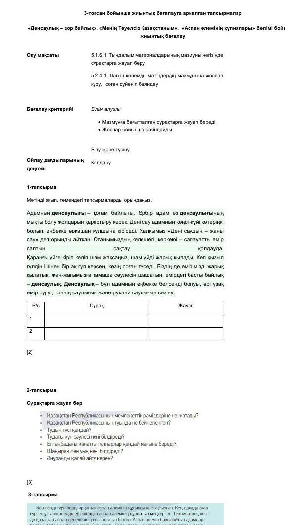 Сұрақ: Дені сау адам қандай болады? Жауап: Дені сау адам көңілді, еңбекке құлшына кіріседі.