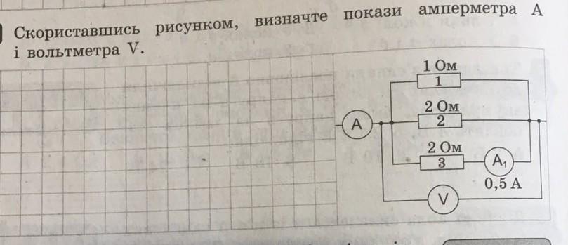 Скориставшись рисонком визначте покази Амперметра А і вольтмерта V ( допоможіть будь ласка)