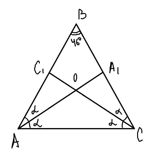 Произвольный треугольник имеет два равных угла. Третий угол в этом треугольнике равен 46°. Из равных углов проведены биссектрисы. Найди меньший угол, который образовывается при пересечении этих биссектрис.
