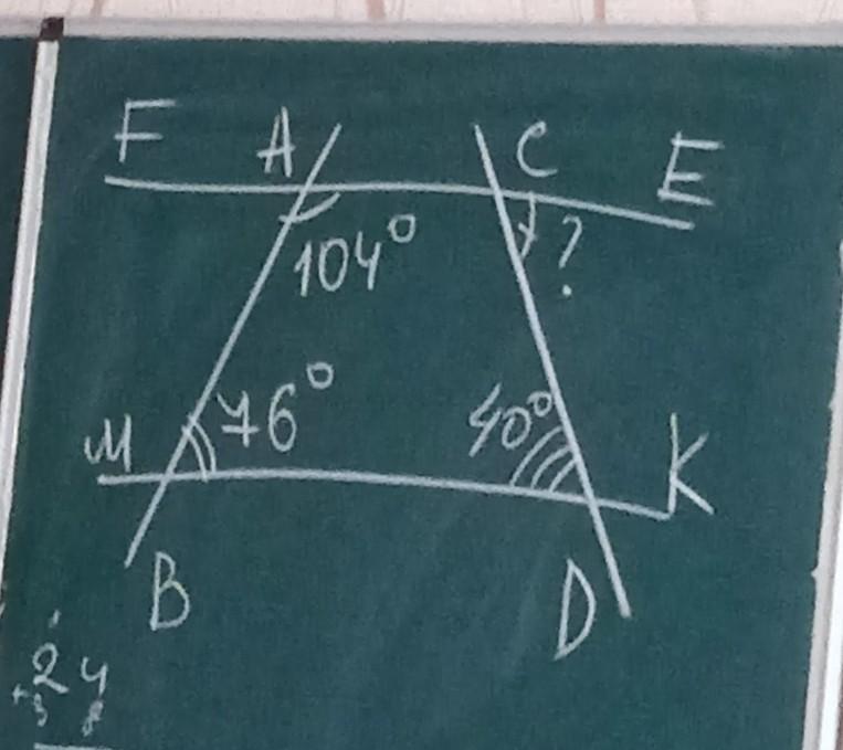 ABCD это трапеция сумма всех углов трапеции 360, а это значит что A+B; C+D=180 соответственно угол AСD=140 нам надо найти угол DCE 180 градусов - 140 градусов = 40 градусов