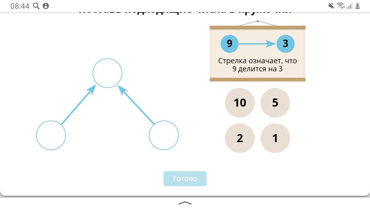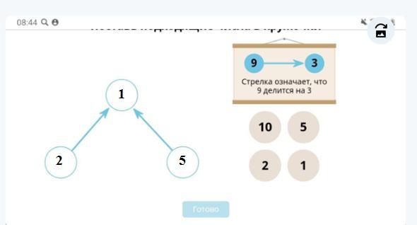 Как я понял, нужно найти такие числа из набора {10; 5; 2; 1}, чтобы левое число нацело делилось на верхнее и правое тоже нацело делилось на верхнее.