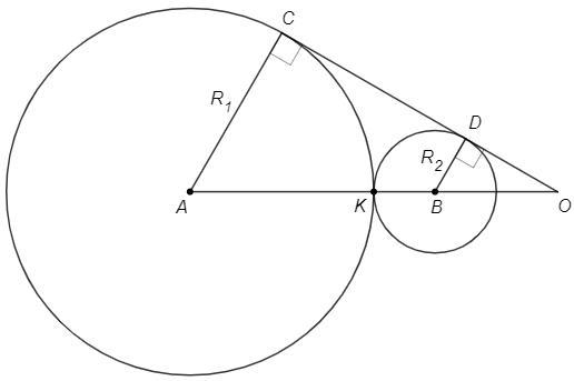 К двум касающимся окружностям проведена общая внешняя касательная, которая пересекается с продолжением линии центров в точке, удаленной от центров на 24 и 72. Определите радиусы.