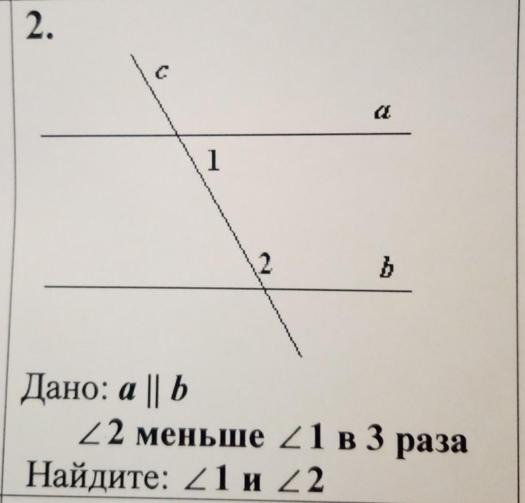 Решение: a||b( по условию), с - секущая, следовательно, сумма 1 и 2 углов равна 180° (как сумма односторонних углов при пересечении параллельных прямых секущей). Возьмем за x угол 2, значит угол 1 = 3x. Получается x + 3x = 180°, 4x=180°, x=180° : 4 = 45°. Угол 2 = 45°, угол 1 = 3 × 45°=135°