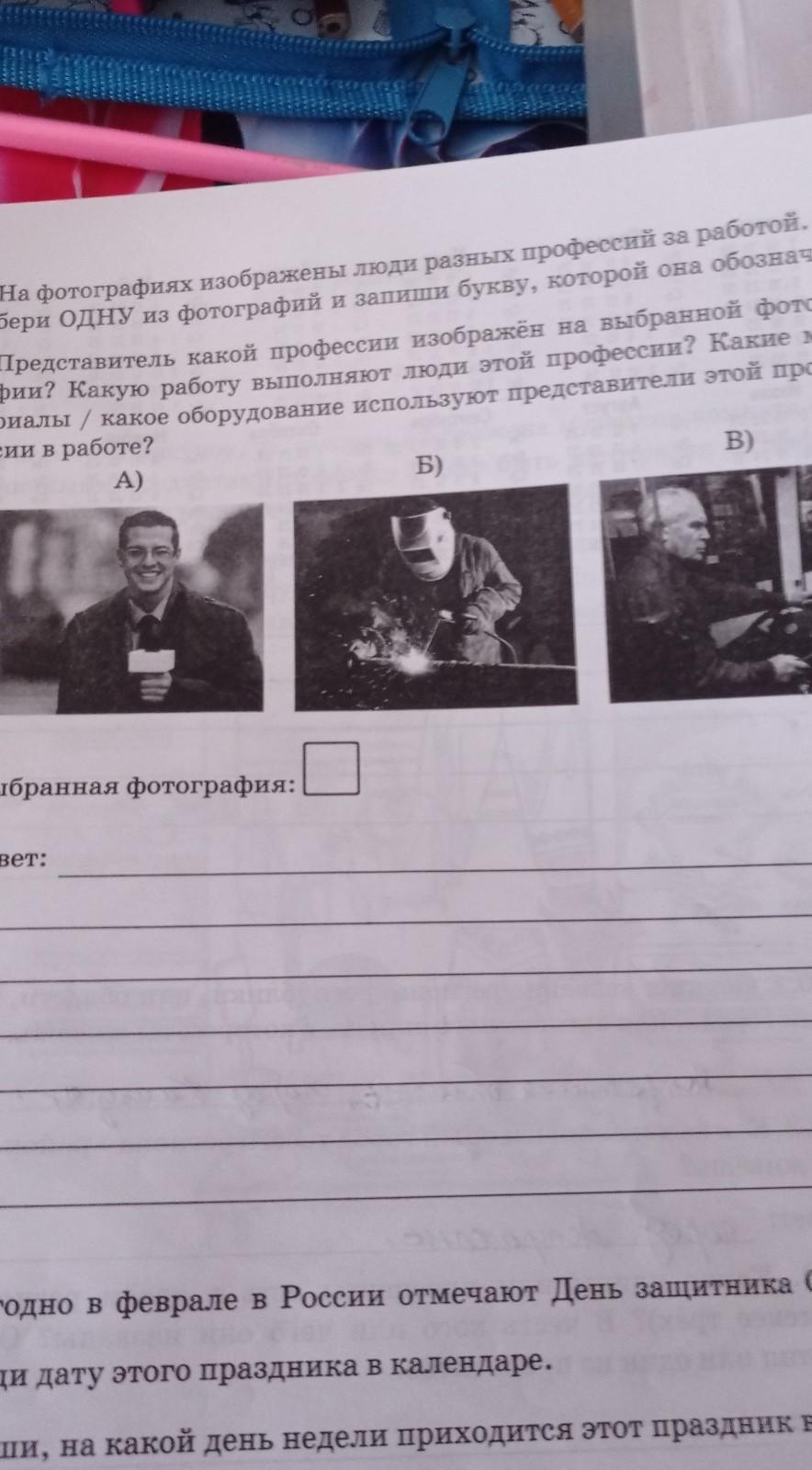 на фотографиях изображены люди разных профессий за работой Выбери одну из фотографий и запиши букву которой она обозначена Представители какой профессии изображён на выбранной фотографии Какую работу выполняет люди этой профессии Какие материалы Какое оборудование используют представители этой профессии в работе