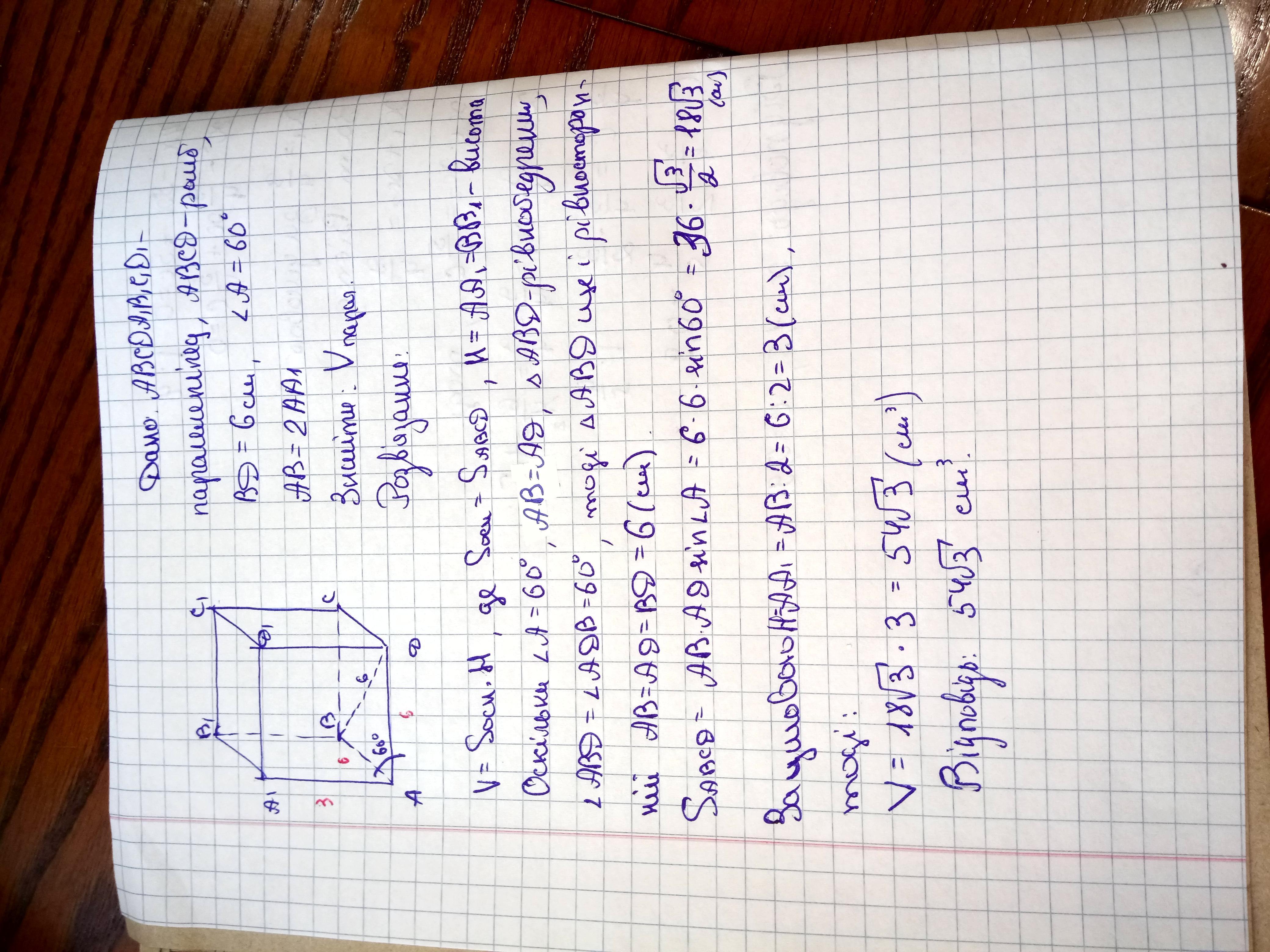 Основою прямого паралелепіпеда є ромб, менша діагональ якого дорівнює 6 см, а гострий кут – 60°. Бічне ребро паралелепіпеда у 2 рази менше від сторони основи. Знайдіть об'єм паралелепіпеда.