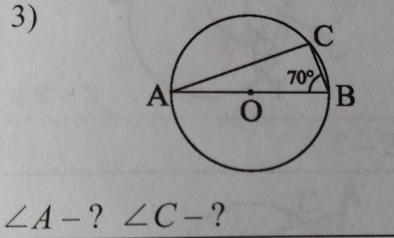 Угол, опирающийся на диаметр - прямой, значит угол С равен 90 градусов. Сумма углов треугольника 180, значит угол А равен 180-70-90 = 20.