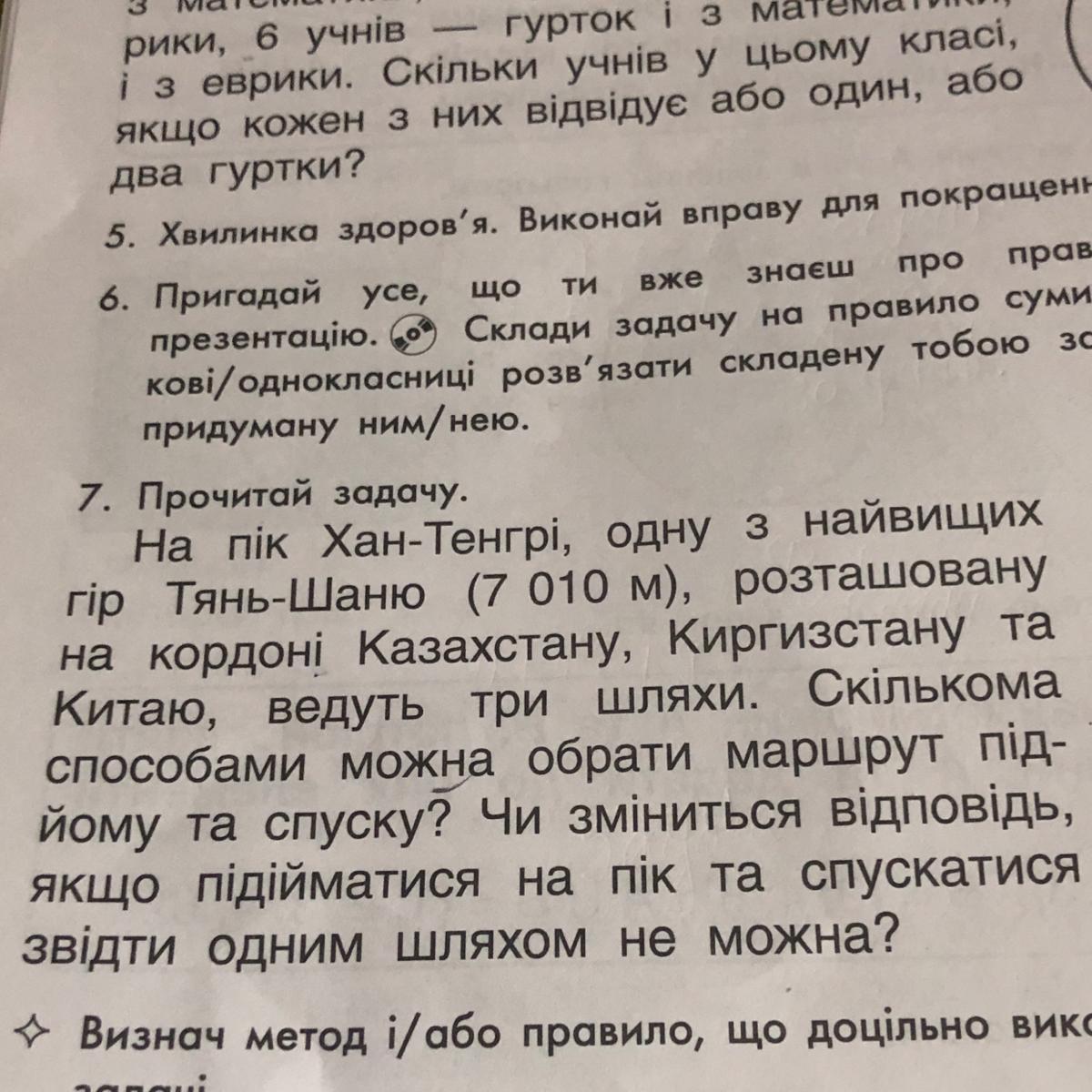 9 способів. 3 способи підйому, три способи спуску. 3•3=9. Відповідь зміниться, якщо підійматися на пік та спускатися з нього треба різними шляхами. тоді відповідь буде: 6 способів.