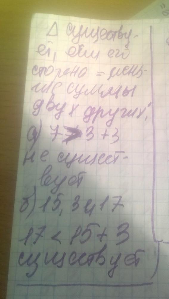 б) 15 см + 3 см = 18 см > 17 см; 15 см + 17 см = 32 см > 3 см; 3 см + 17 см = 20 см > 15 см ⇒ существует.