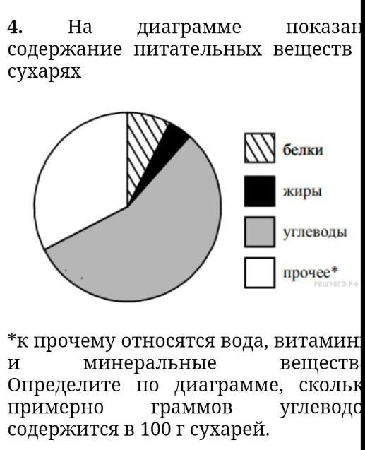 ПОДПИШУСЬ , БАЛЛЫ И ЗВЕЗДЫ АЛГЕБРА 7 КЛАСС ребят, такая тема:к прочему относятся вода, витамины и минеральные вещества. Определите по диаграмме, сколько примерно граммов углеводов содержится в 100 г сухарей.