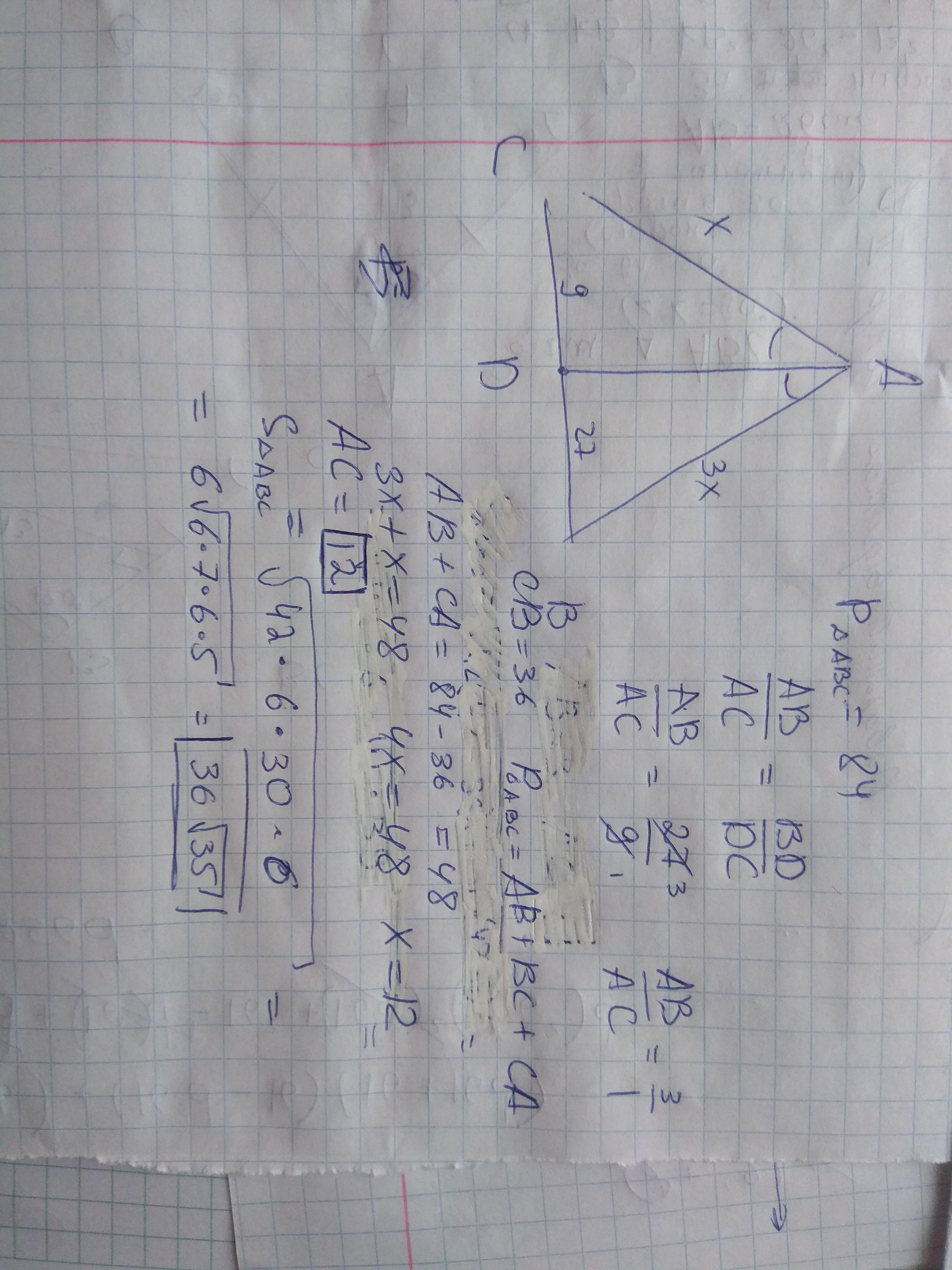 Биссектриса AD треугольника ABC делит сторону BC на отрезки CD և BD. CD=9, BD=27, а периметр треугольника ABC равно 84.