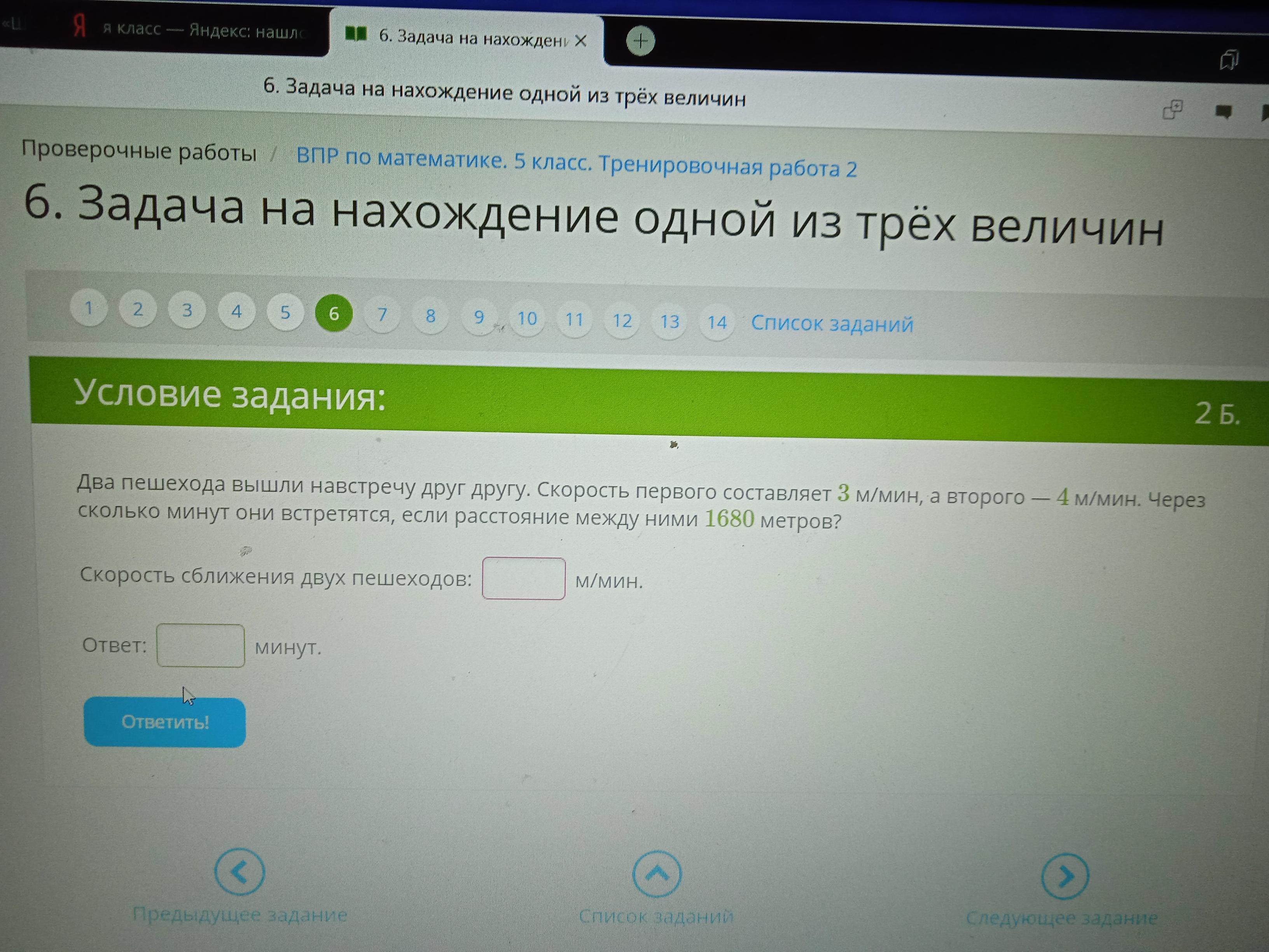 расстояние нужно поделить на скорость сближения двух пешеходов (3 м/мин + 4 м/мин = 7 м/мин)