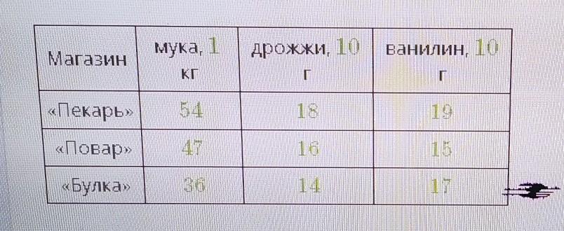 составила таблицу с ценами на продукты для выпечки из разных магазинов. Мука продаётся килограммами, а