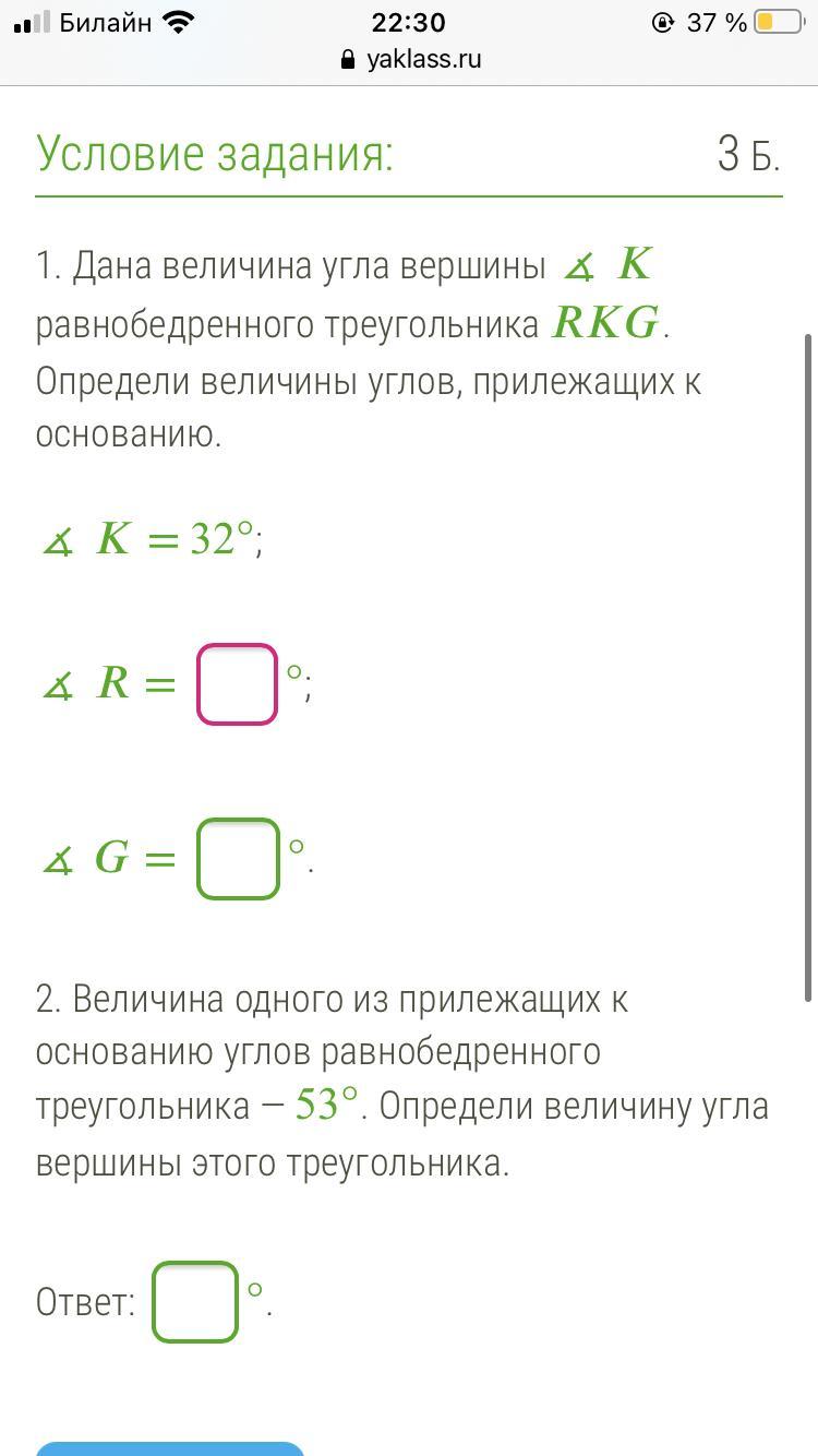 Угол вершины треугольника = 180-53×2=74°