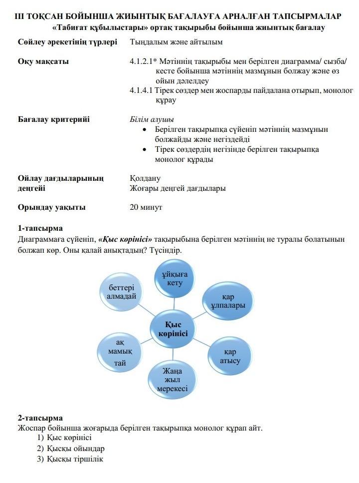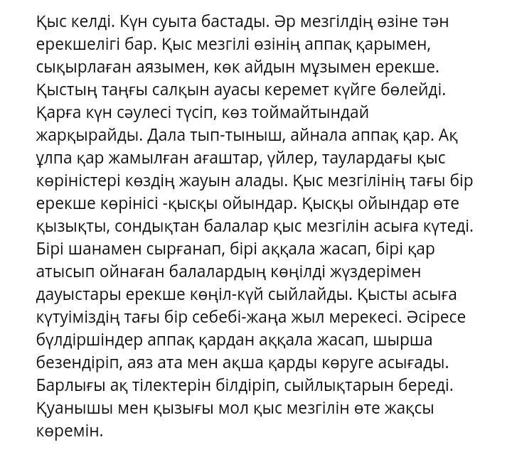 Қыс мезілінде қар ұлпалары ақ мамықтай болып жауады. Балалар далада шанамен сырғанап ойнап жүр. Қар атысып ойнап жүр. Қыста күн өте суық болады. Қыста жанардың арасында аю аңды қысқы күні ұйқыға кетеді