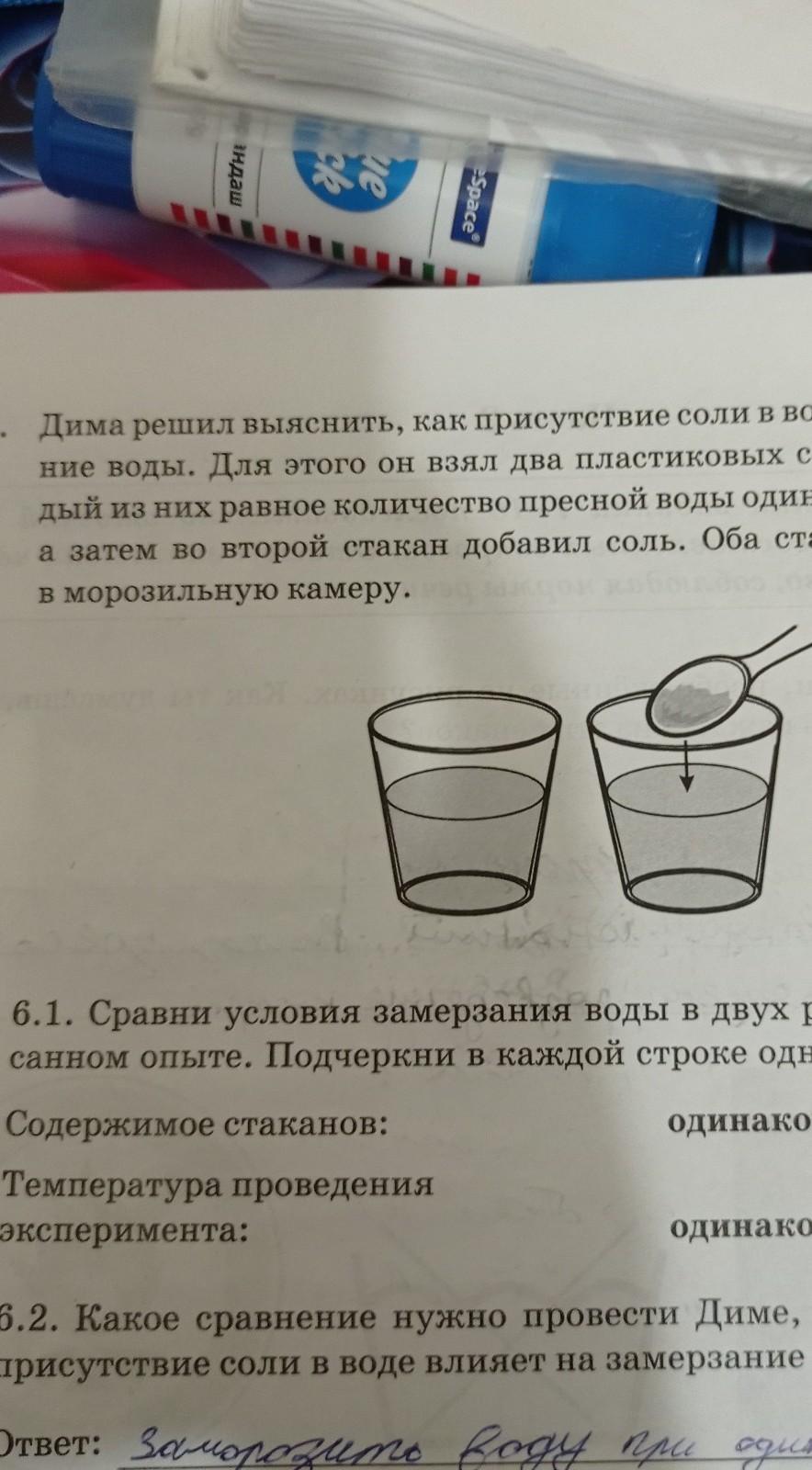 Сравни условия замерзание воды в 2 разных стаканах в описанном опыте подчеркни В каждой строке одно из выделенных слов содержание стаканов одинаковое или различное ?температура проведения эксперимента это одинаковая или различная?