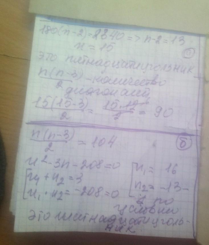 1.В опуклому многокутнику сума кутів дорівнює 2340.Знайдіть кількість його сторін і діагоналей.