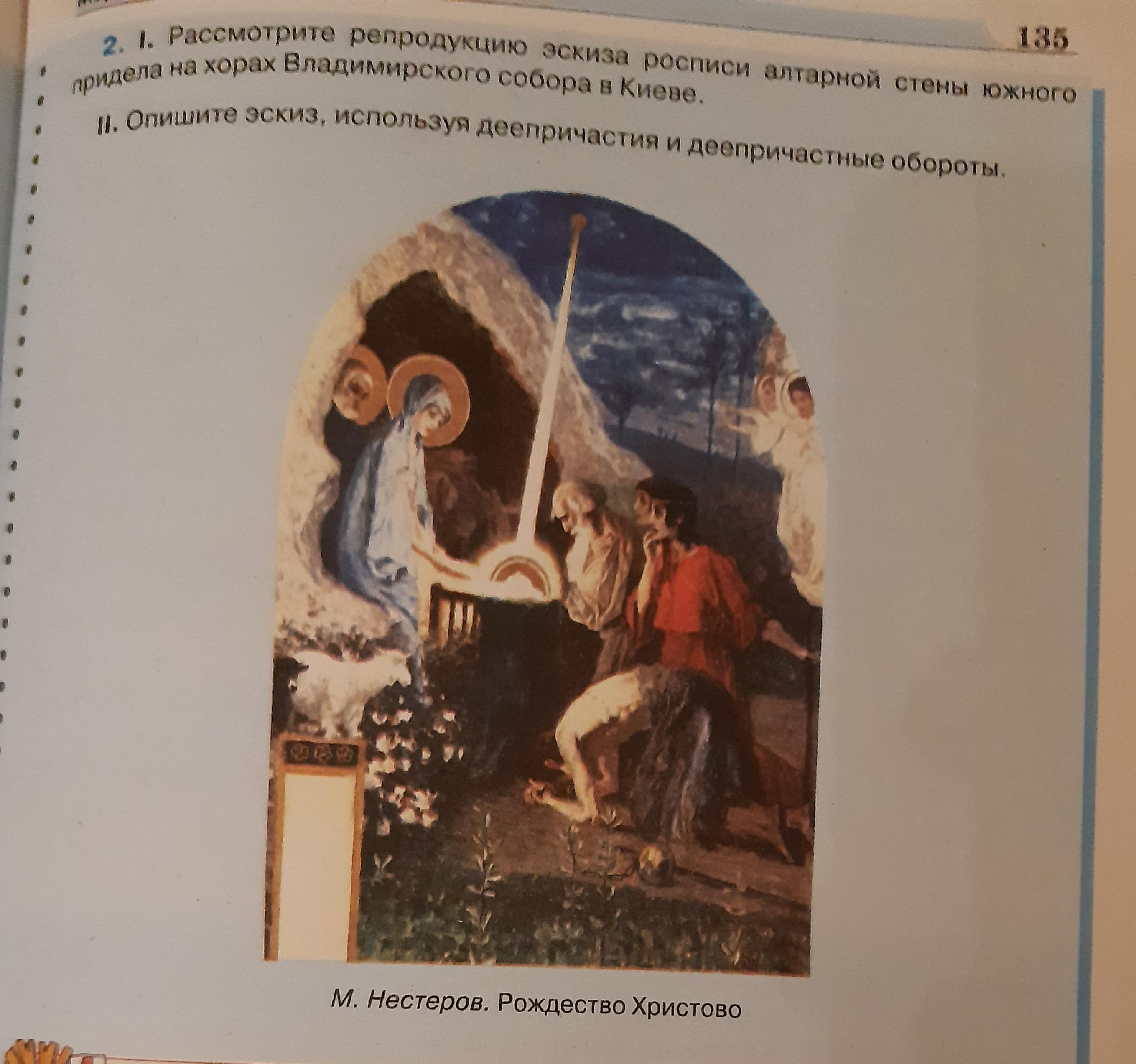 На эскизе изображена сцена преклонения перед новорожденным Иисусом. Автор очень своеобразно обращает наше внимание на главное в этой росписи, изобразив яркий звездный луч, который падает прямо в ясли. Мы не видим младенца, но точно знаем, что это Сын Божий. Он лежит, излучая ослепительное сияние. Слева от яслей стоит Богоматерь. Одев ЕЕ в бледно-голубую одежду, художник делает фигуру тоже светящейся, только каким-то лунным светом. Мария слегка наклонилась вперед, заботливо поправляя одеялко. За ней стоит Иосиф, но автор как будто не желает привлекать к нему внимание, изображая в глубине, в тени пещеры. Ясно видно только его седую голову и взгляд, обращенный к младенцу.
