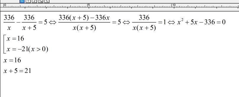 Из пункта A в пункт B, расстояние между которыми 336 км, одновременно выехали два велосипедиста. Известно, что первый велосипедист за час проезжает на 5 км больше, чем второй. Определите скорость второго велосипедиста, если известно, что он прибыл в пункт B на 5 часов позже первого. Ответ дайте в км/ч.