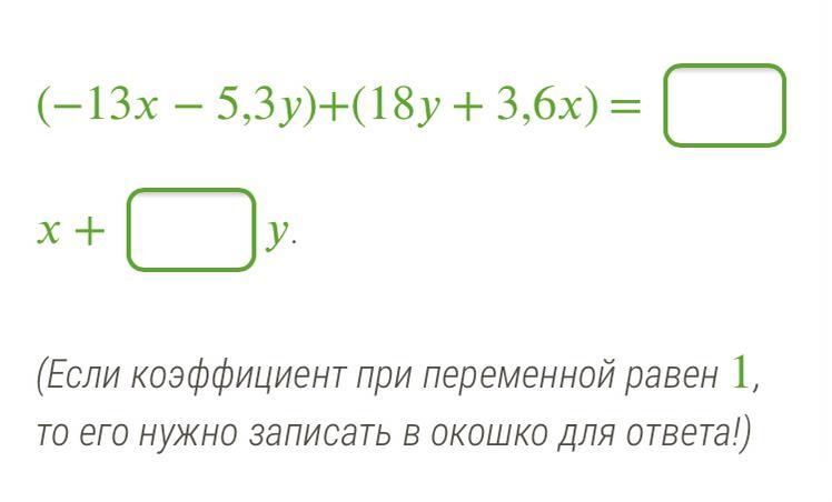Объяснение: -13x-5,3y+18y+3,6x= -13x+3.6x-5.3y+18y = -9.4x+12.7y