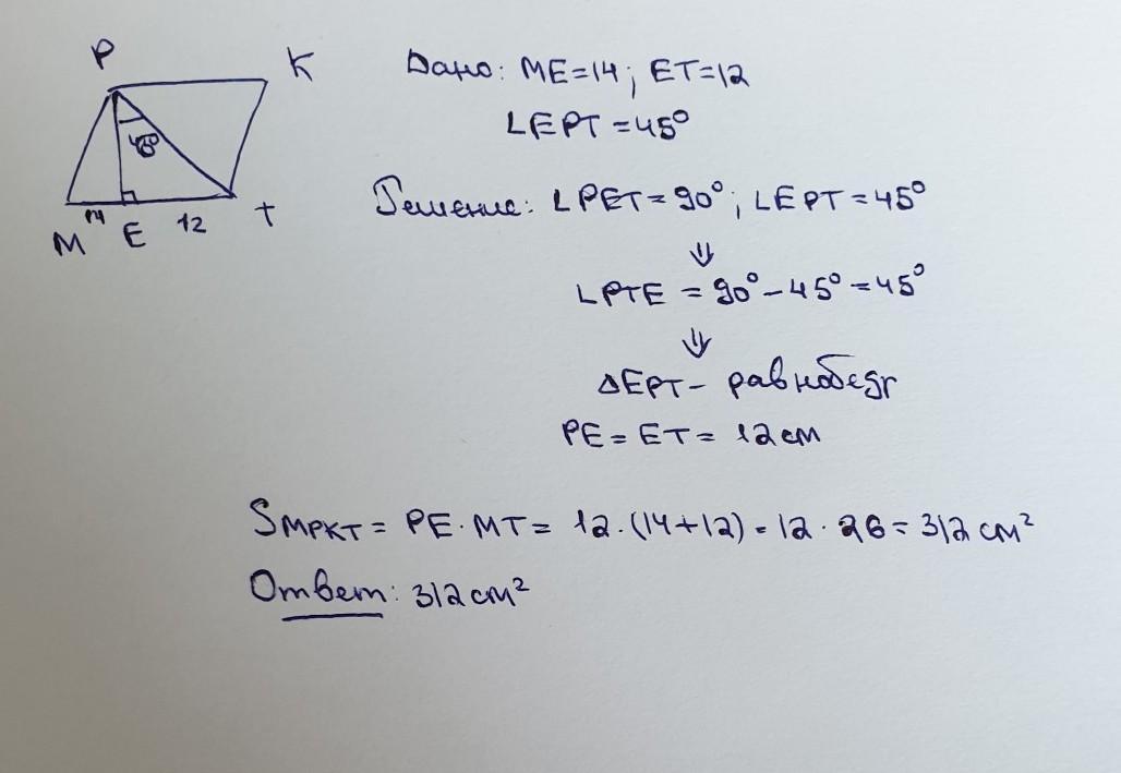 В параллелограмме MPKT на стороне MT отмечена точка E, ∠PEM =900 ∠EPT = 450, , МЕ = 14 см, ЕТ = 12 см. Найдите площадь параллелограмма