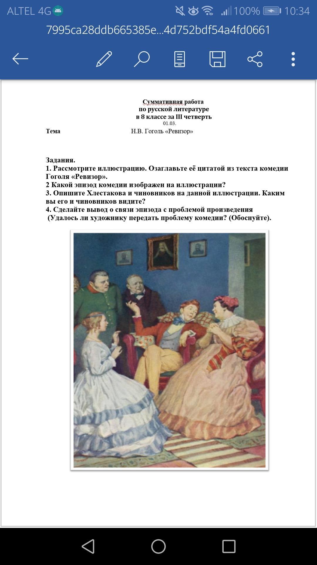 На картине изображен эпизод, когда Хлестаков находится в доме городничего. Он рассказывает всякие небылицы его жене и дочери, они с восторгом слушают и удивляются.