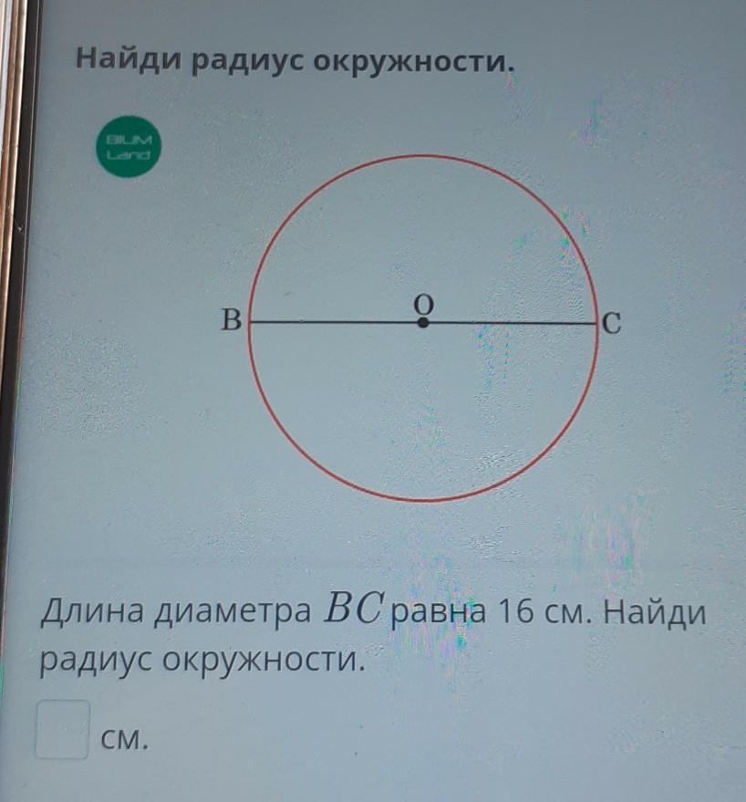 Длина диаметра ВС равна 16 см. Найди