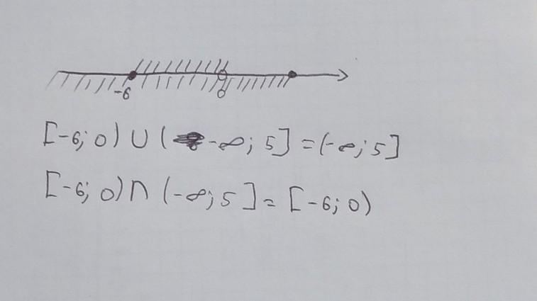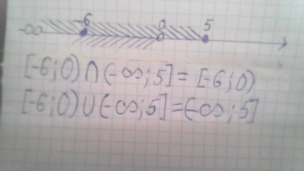 Изобразите на координатной прямой и запишите пересечение и объединение числовых промежутков: [ – 6; 0) и (−∞; 5] .