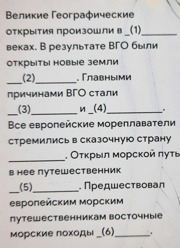 Ответ:Вели́кие географи́ческие откры́тия — период в истории человечества, начавшийся в XV веке и продолжавшийся до XVII века, в ходе которого европейцы открывали новые земли и морские маршруты в Африку, Америку, Азию и Океанию в поисках новых торговых партнёров и источников товаров, пользовавшихся большим спросом в Европе. Историки обычно соотносят «Великие географические открытия»[1][2] с первопроходческими дальними морскими путешествиями португальских и испанских путешественников в поисках альтернативных торговых путей в «Индии» за золотом, серебром и пряностями