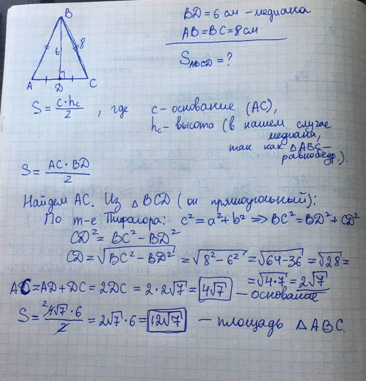 медиана проведенная к основанию равнобедрянного треугольника, равна 6 см, а боковая сторона 8 см. Найди площадь данного треугольника.