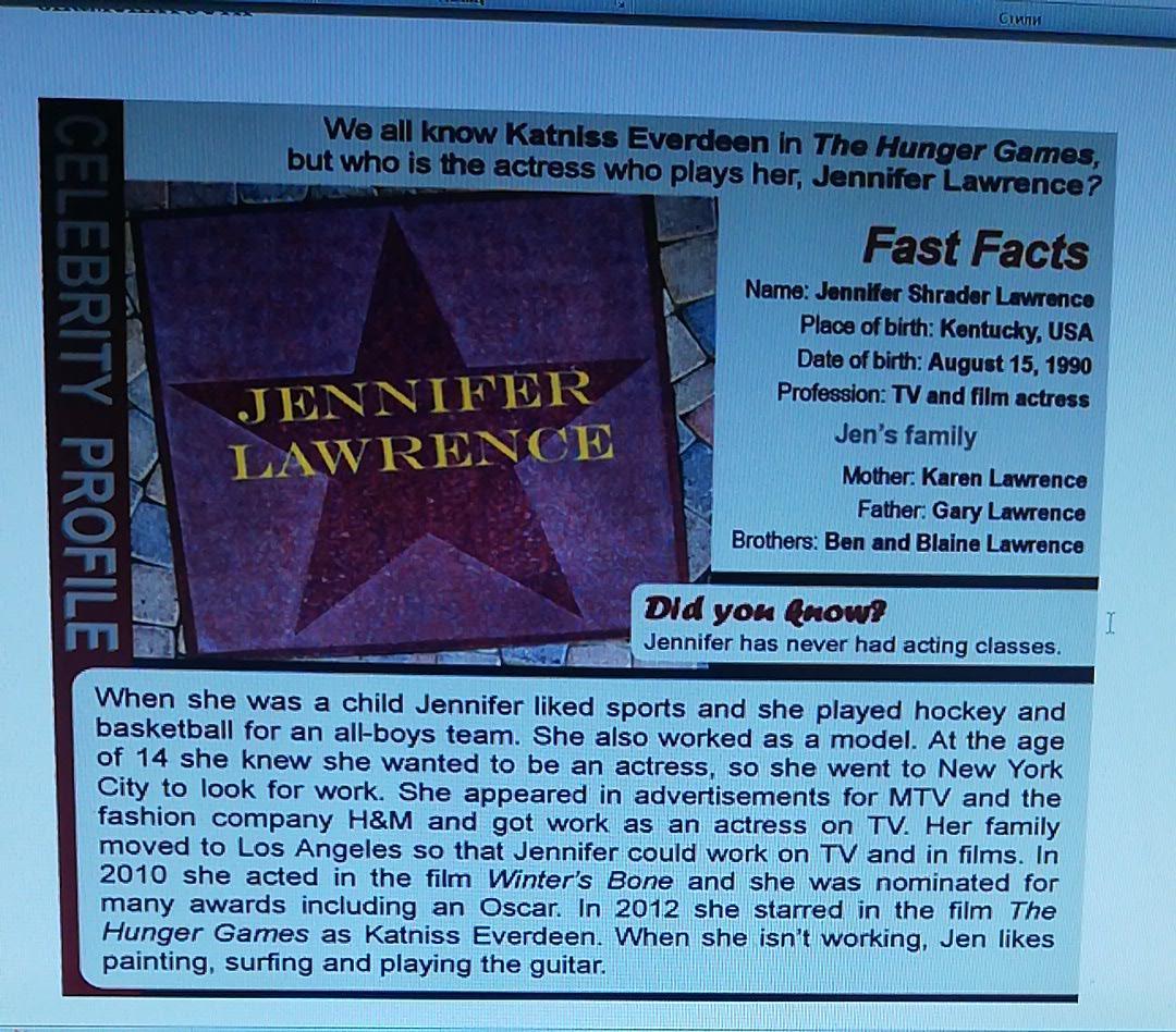 Task 1 Read the magazine article and do the exercise- Прочитай статью в журнале о знаменитости