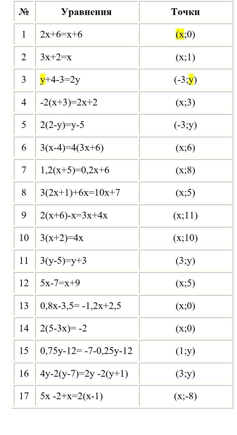 карточки с уравнениями. Найдите недостающие координаты точек, решив уравнения.