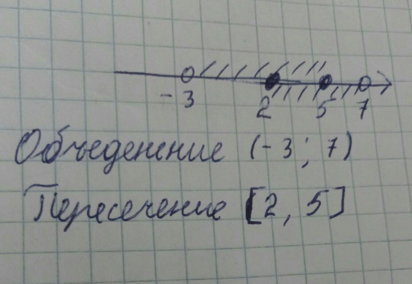 объединение числовых промежутков: (– 3; 5] и [2; 7).