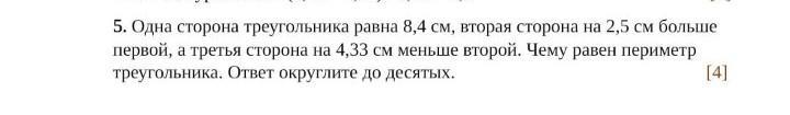 Одна сторона треугольника равна 8,4 см вторая сторона на 2,5 см больше первой а третья сторона на 4,33