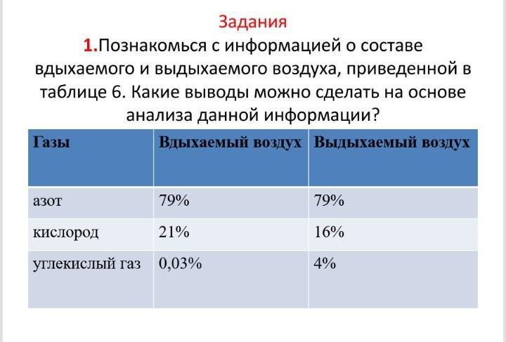 познакомься с информацией о составе вдыхаемого и выдыхаемого воздуха приведенной в таблице 33 баллов дам и 5 звёзд