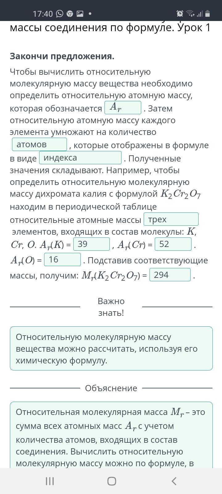 Закончи предложения. Чтобы вычислить относительную молекулярную массу вещества необходимо определить относительную атомную массу, которая обозначается . Затем относительную атомную массу каждого элемента умножают на количество , которые отображены в формуле в виде . Полученные значения складывают. Например, чтобы определить относительную молекулярную массу дихромата калия с формулой K2Cr2O7 находим в периодической таблице относительные атомные массы элементов, входящих в состав молекулы: K, Cr, O. Ar(K) = , Ar(Cr) = . Ar(O) = . Подставив соответствующие массы, получим: Mr(K2Cr2O7) = .