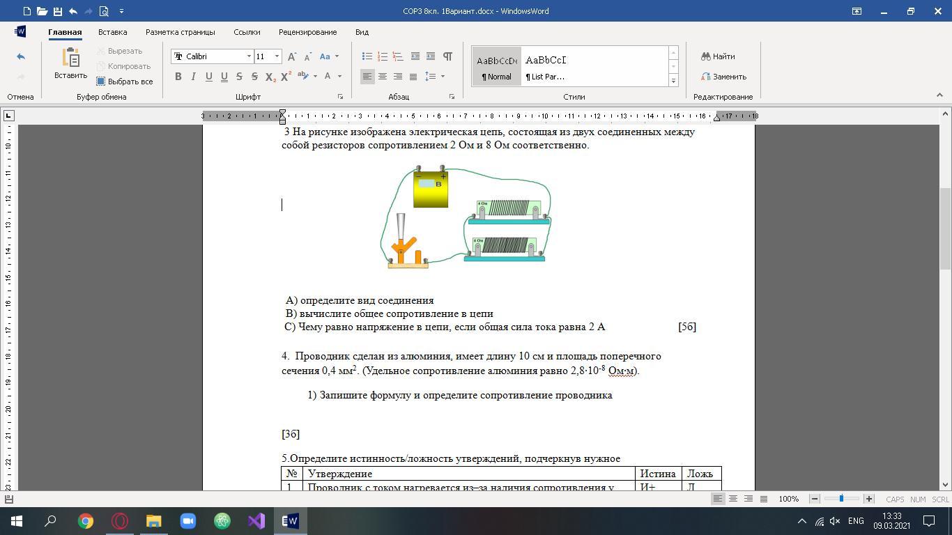 На рисунке изображена электрическая цепь, состоящая из двух соединенных между собой резисторов сопротивлением 2 Ом и 8 Ом соответственно. А) определите вид соединения