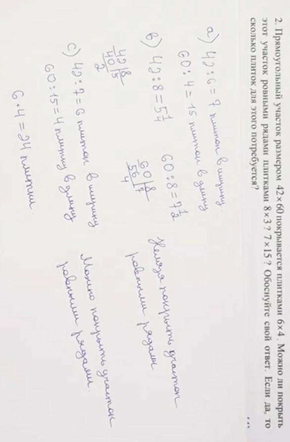Помогите пожалуйста!!! Прямоугольный участок размером 42×60 покрывается плитками 12×8. Можно ли покрыть этот участок ровными рядами плитками 8×3? 7 ×15? Обоснуйте свой ответ. Если да, то сколько плиток для этого потребуется?