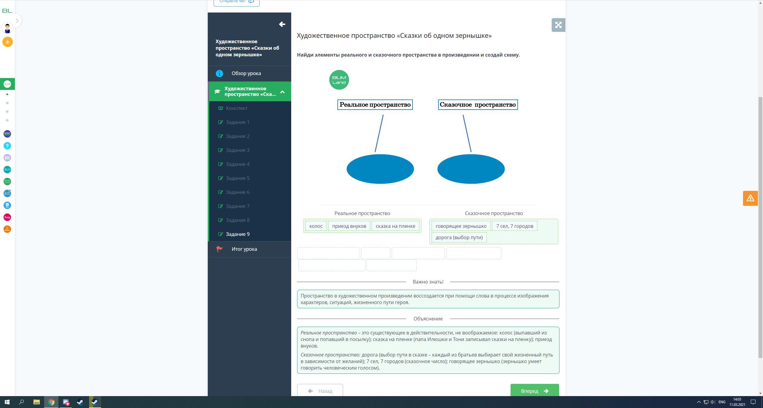 Найди элементы реального и сказочного пространства в произведении и создай схему.