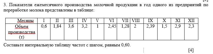 Показатели ежемесячного производства молочной продукции в год одного из предприятий по переработке молока представлены в таблице: Месяцы I II III IV V VI VII VIII IХ Х ХI ХII Объем производства (т) 0,6 1,84 3,6 3,2 1 2,45 1,28 2 2,39 1,5 2,9 2,3 Составьте интервальную таблицу частот с шагом, равным 0,60.