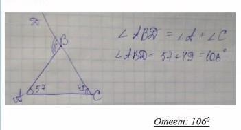 . В треугольнике АВС внутренний угол при вершине А равен 67 , а внутренний при вершине С равен 38 . Найдите внешний угол при вершине В