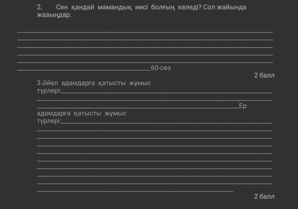 2) Әйел адамдарға қатысты жұмыс түрлері: Медбике,Ұстаз,Шаштараз,Аспаз,Бухгалтер,Психолог,Журналист,Заңгер