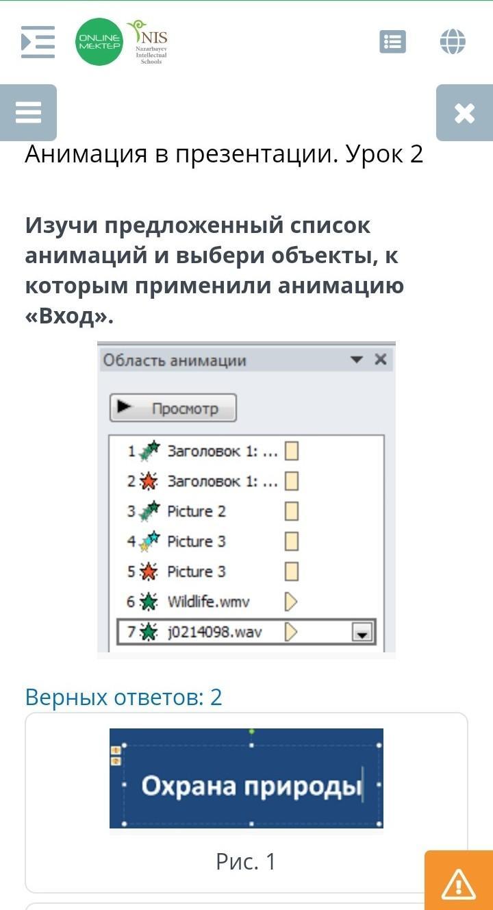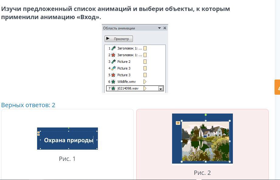 Изучи предложенный список анимаций и выбери объекты, к которым применили анимацию « Вход»