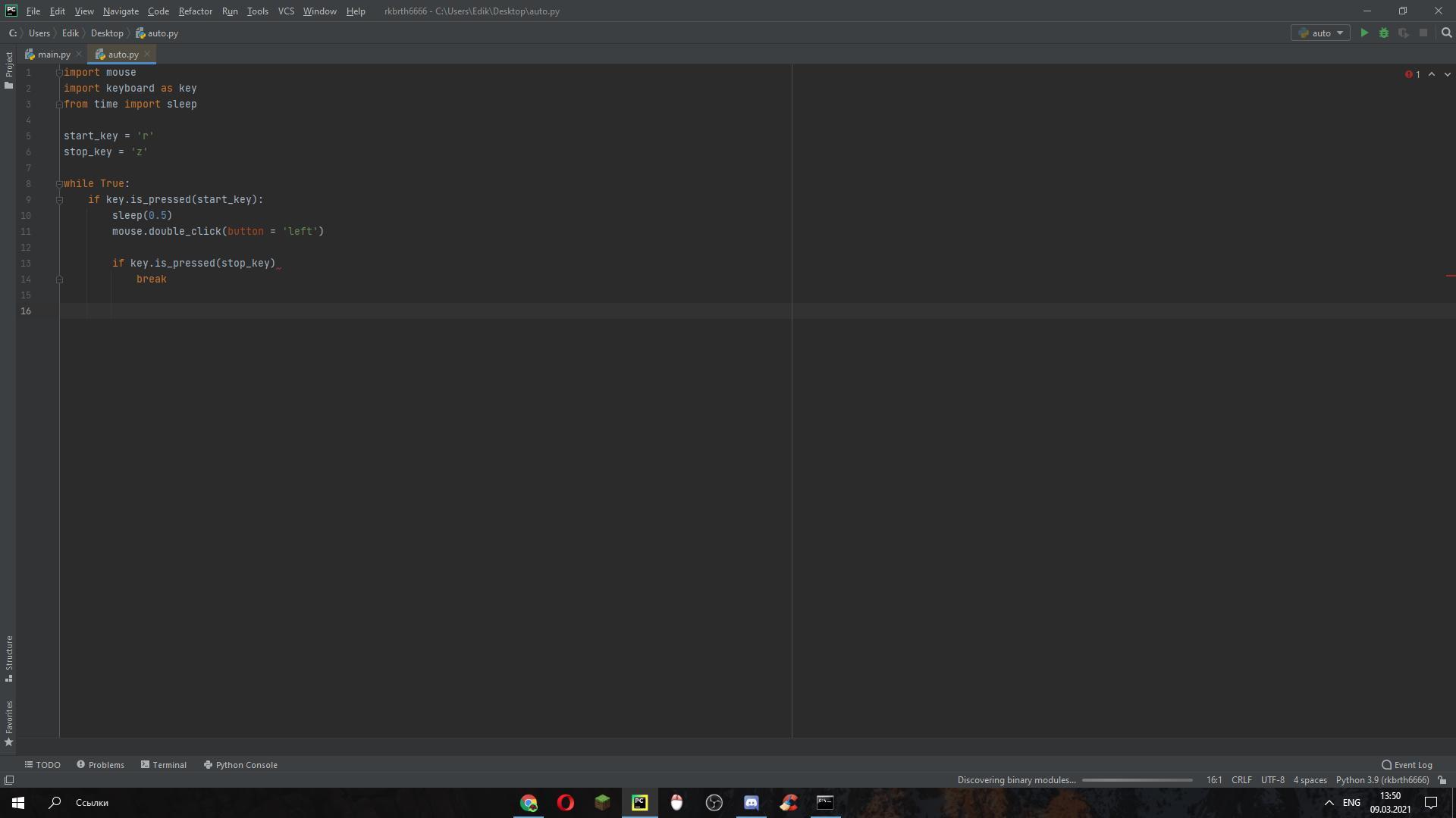 Прошу о помощи! Я написал код для автокликера, вроде всё также, как и в видео, но при этом консоль выдаёт