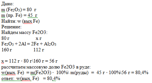 Вычислите выход продукта реакции взаимодействия 80 г Fe₂O₃ с алюминием,если при этом получено 45 г железа.