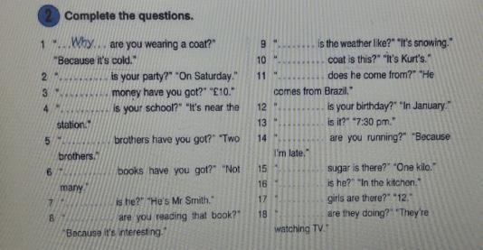 Answer the questions. this kind of weather? "" Snowing. "Is this a coat?" "this is Kurt." 1. Why ... are you wearing a coat? "" Because it is cold ". 10 is your party? " "On Saturday." 11 "where is he from?" "Do you have INNIN money?" "10 pounds sterling". your school "" It's not far from arriving from Brazil, "is it your birthday?" "In January." this is? "" 19:30. "4 12 stations". Do you have 13 brothers? "" Are you two running? "" Because 5. 14 brothers. I'm late "have you got sugar?" "One kilogram". is he? "" In the kitchen. "Do you have any books?" "Aren't there many 16 girls there?" "12. do they do?" "Is it he?" "He's Mr. Smith." 17 18 8. Are you reading this book? "Because it's interesting. Watching TV".помогите пожалуйста