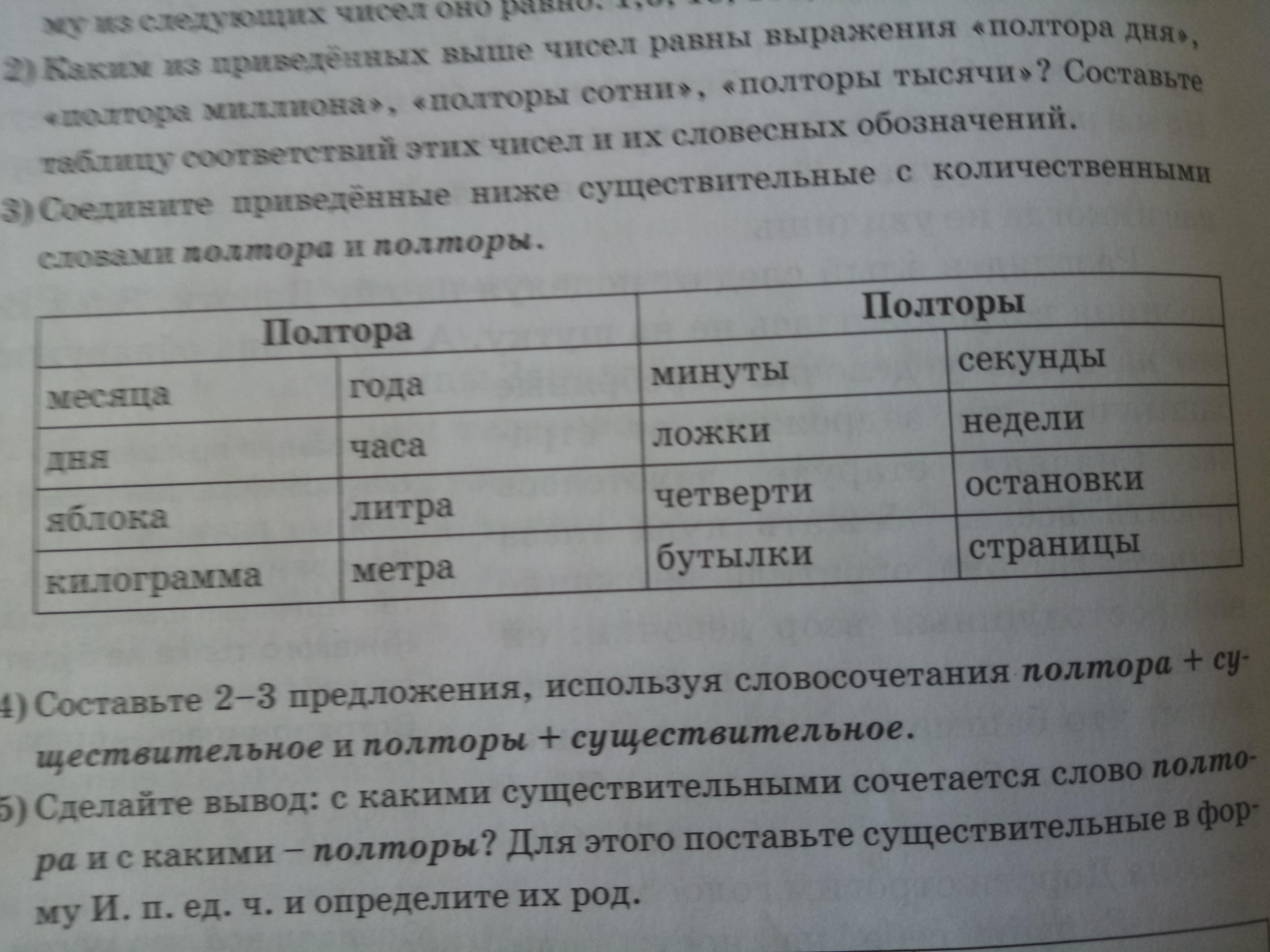 3) соедините приведённые ниже существительные с количественными словами полтора и полторы.